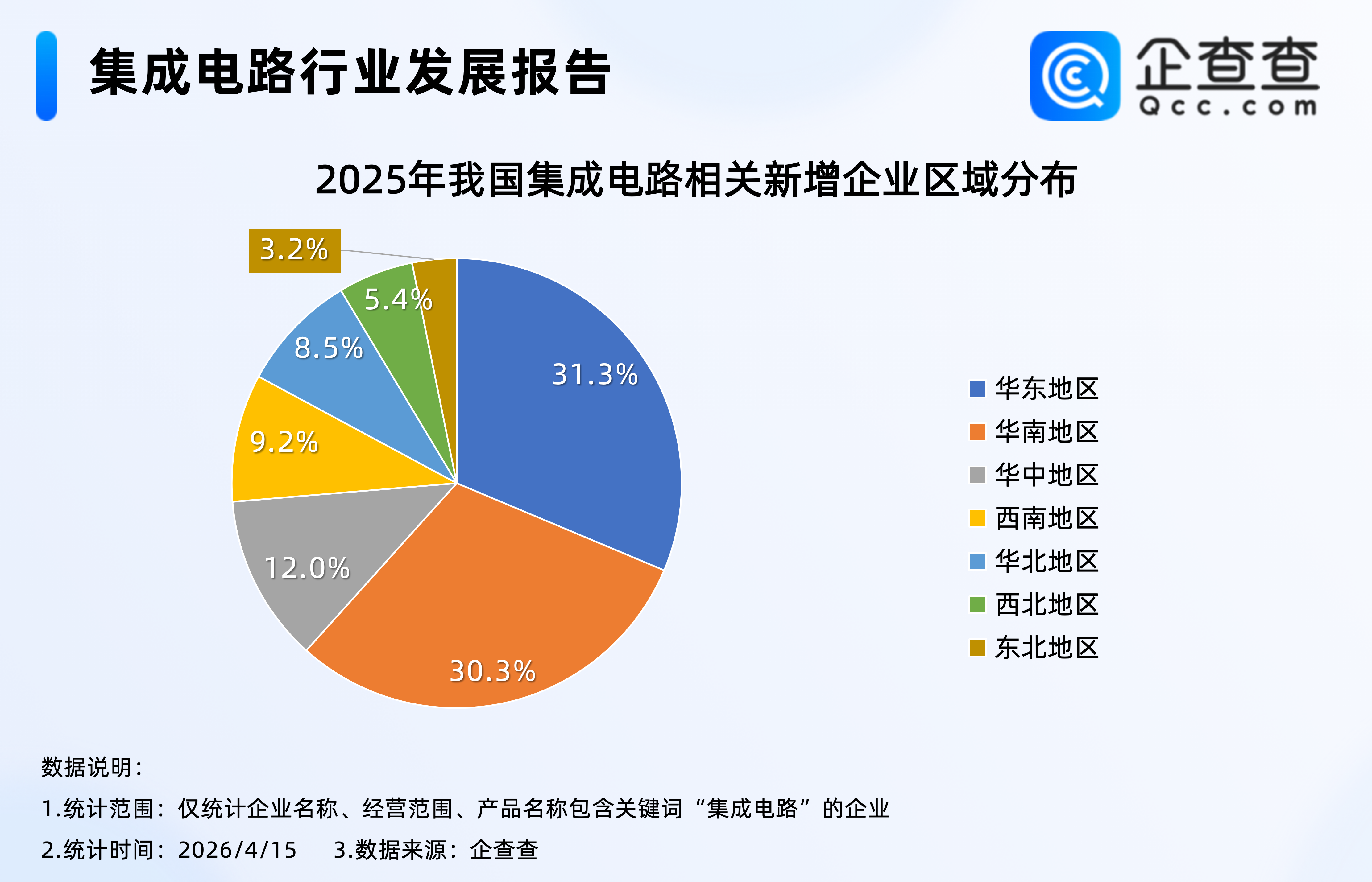 企查查数据显示,2025年注册的4.1万家集成电路相关企业中,分布在华东、华南地区的相关企业合计占比超六成。其中,位于华东地区的相关企业最多,占比31.3%,位于华南地区的相关企业占比30.3%,西北、东北地区相对较少,分别占比5.4%、3.2%。