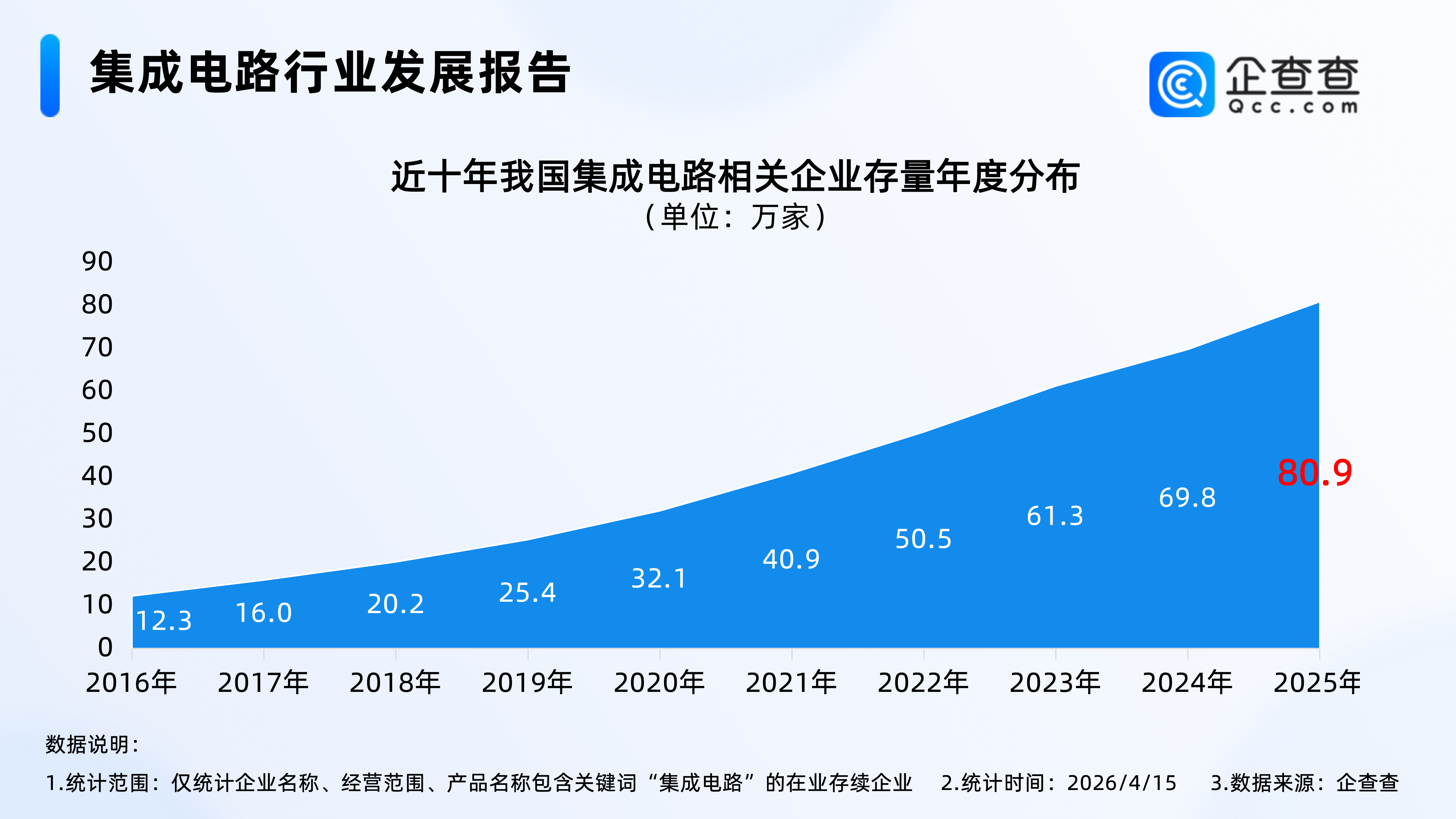 企查查数据显示,近十年,我国集成电路相关企业存量逐年增加,2025年年底,我国在业存续80.9万家集成电路相关企业。截至2026年4月15日,我国现存83.8万家集成电路相关企业。